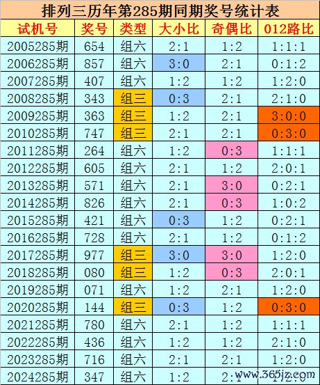 大小分析:历史上胪列三第285期同时奖号中,大小比3:0开出2期,大小比0:3开出3期,大小比1:2开出7期,大小比2:1开出8期,大小奖号总比例开出29:31,小 号走势较热,本年第285期瞻望小 号赓续热出,瞻望大小比为1:2。